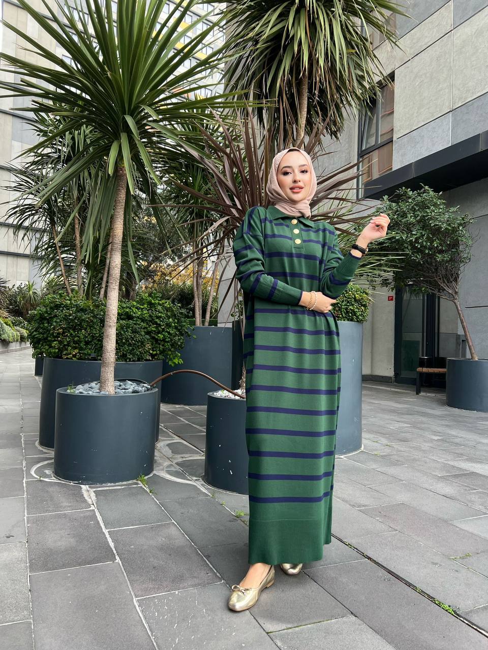 فستان تريكو مخطط 33 زيتي مع كحلي