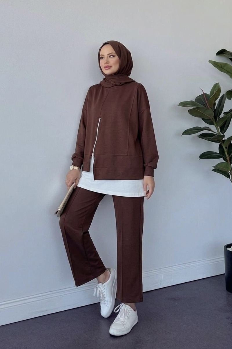 طقم بلوزة نص سحاب 6009 زيتي فاتح