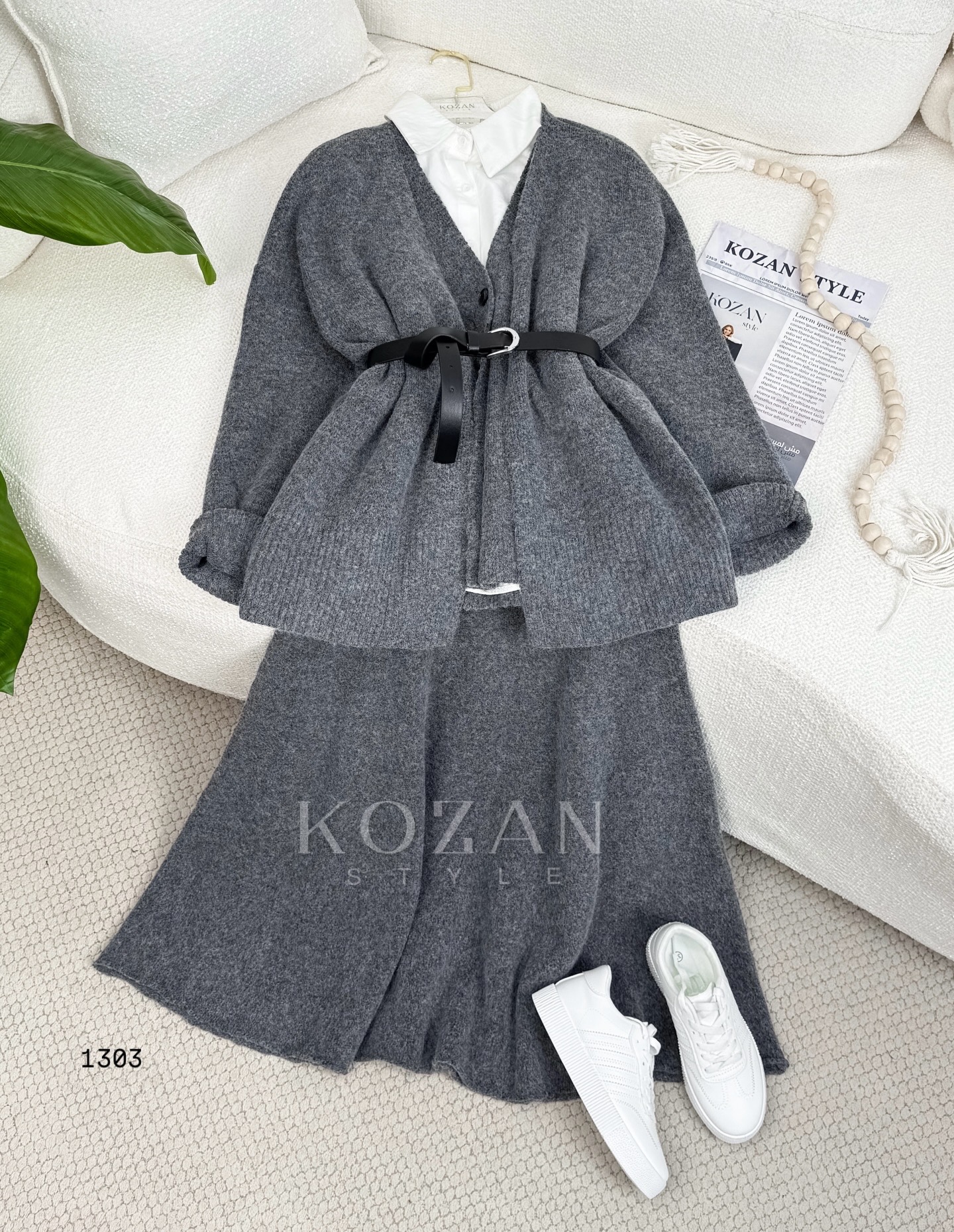 طقم صوف 3 قطع تنورة 1303 رمادي