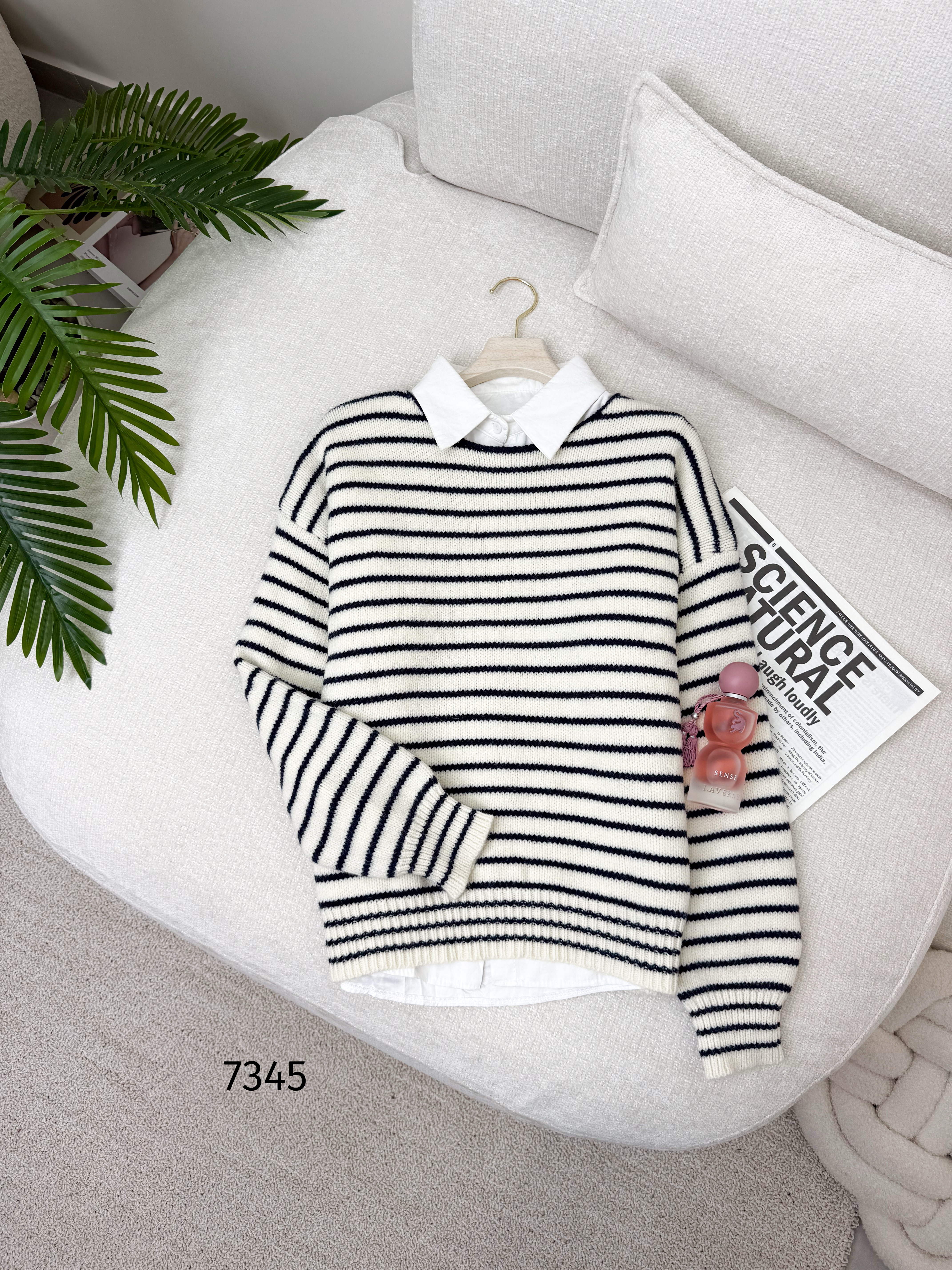 بلوزة صوف مخطط 7345 ابيض مخطط كحلي