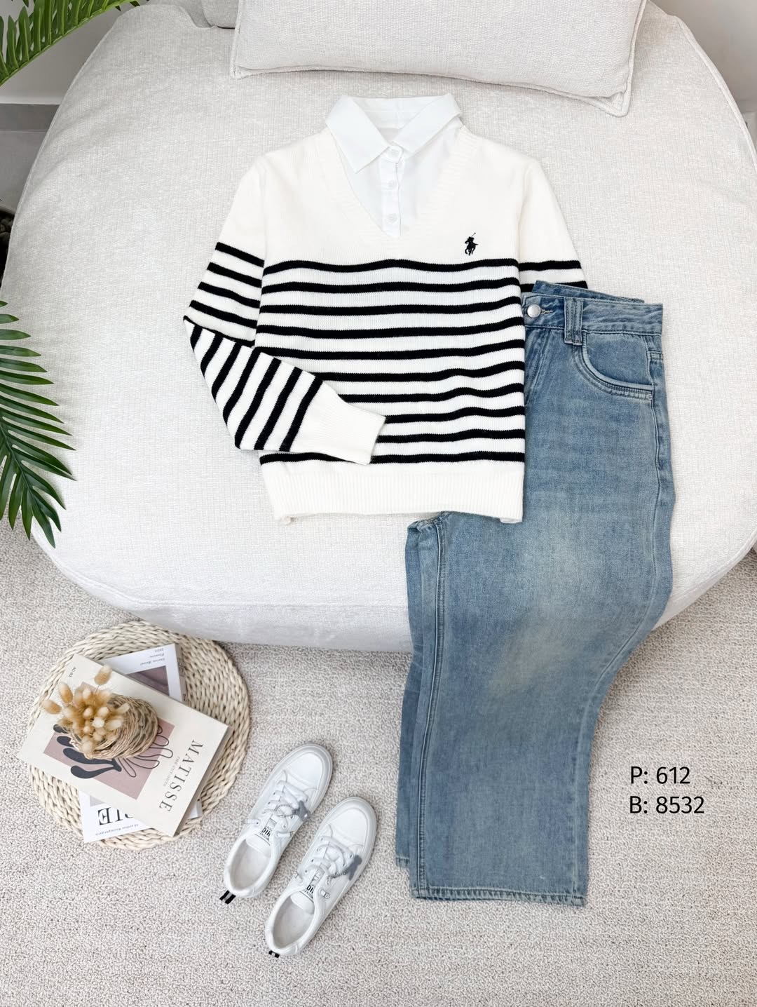 بلوزة بولو مخططة قبة قميص 612 سكني مخطط ابيض