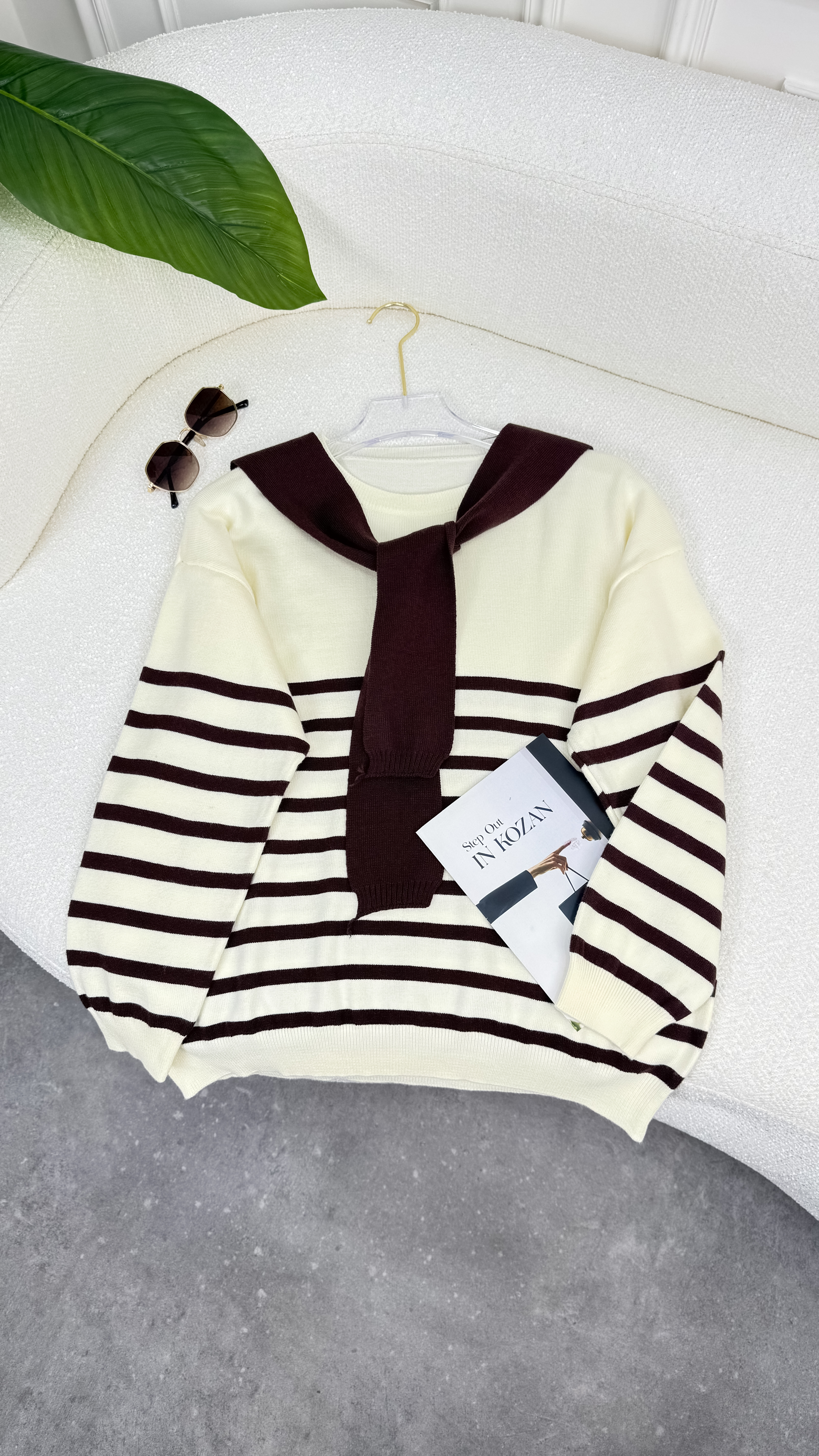 بلوزة مخطط من تحت مع شال 635187 كبتشينو