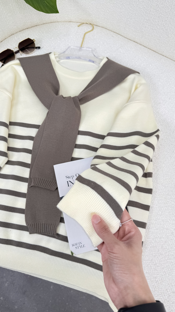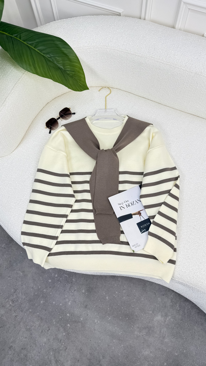 بلوزة مخطط من تحت مع شال 635187 كبتشينو
