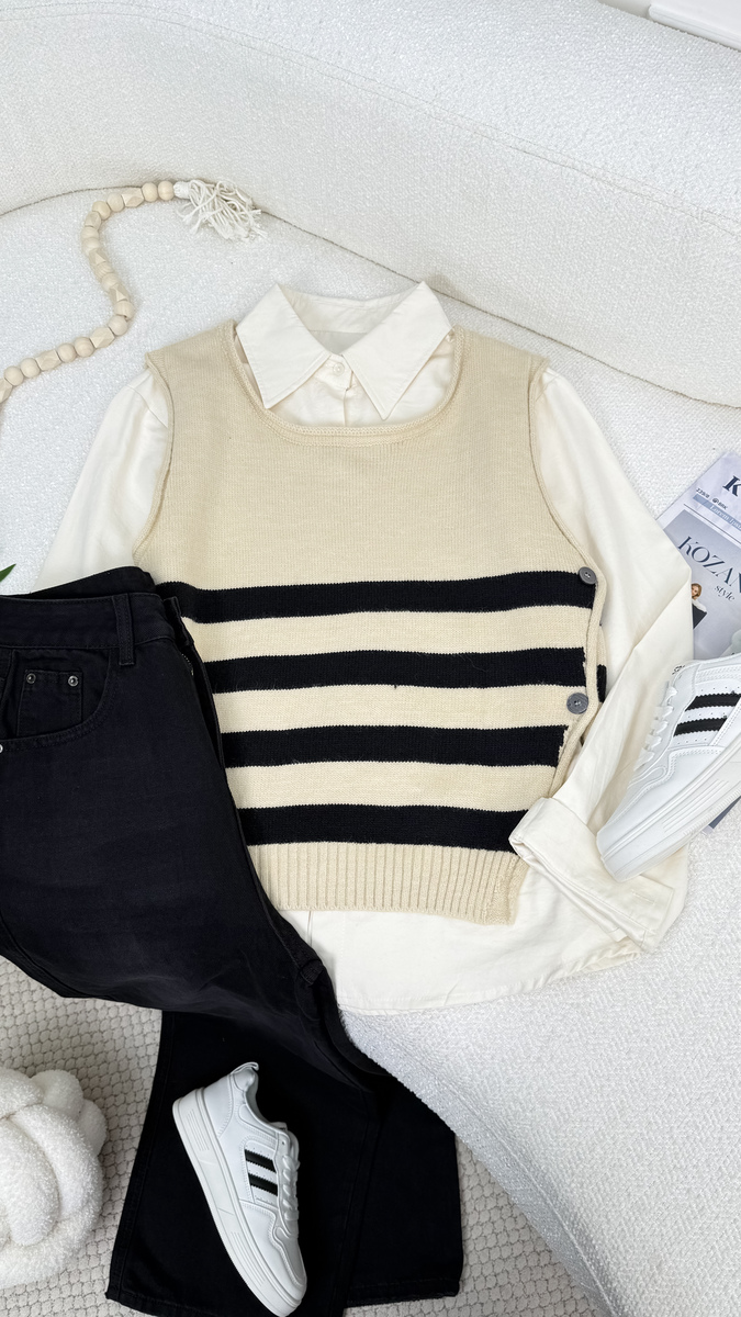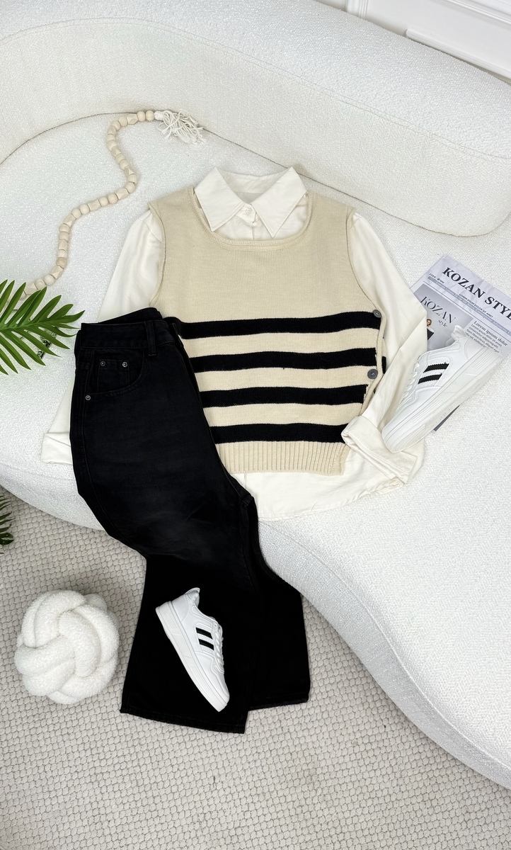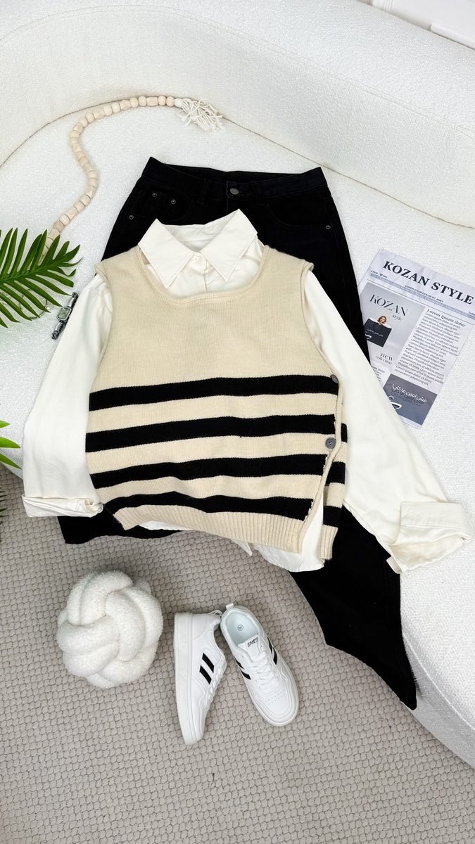 فزت مخطط m3572 اسود وبيج /قميص بيج