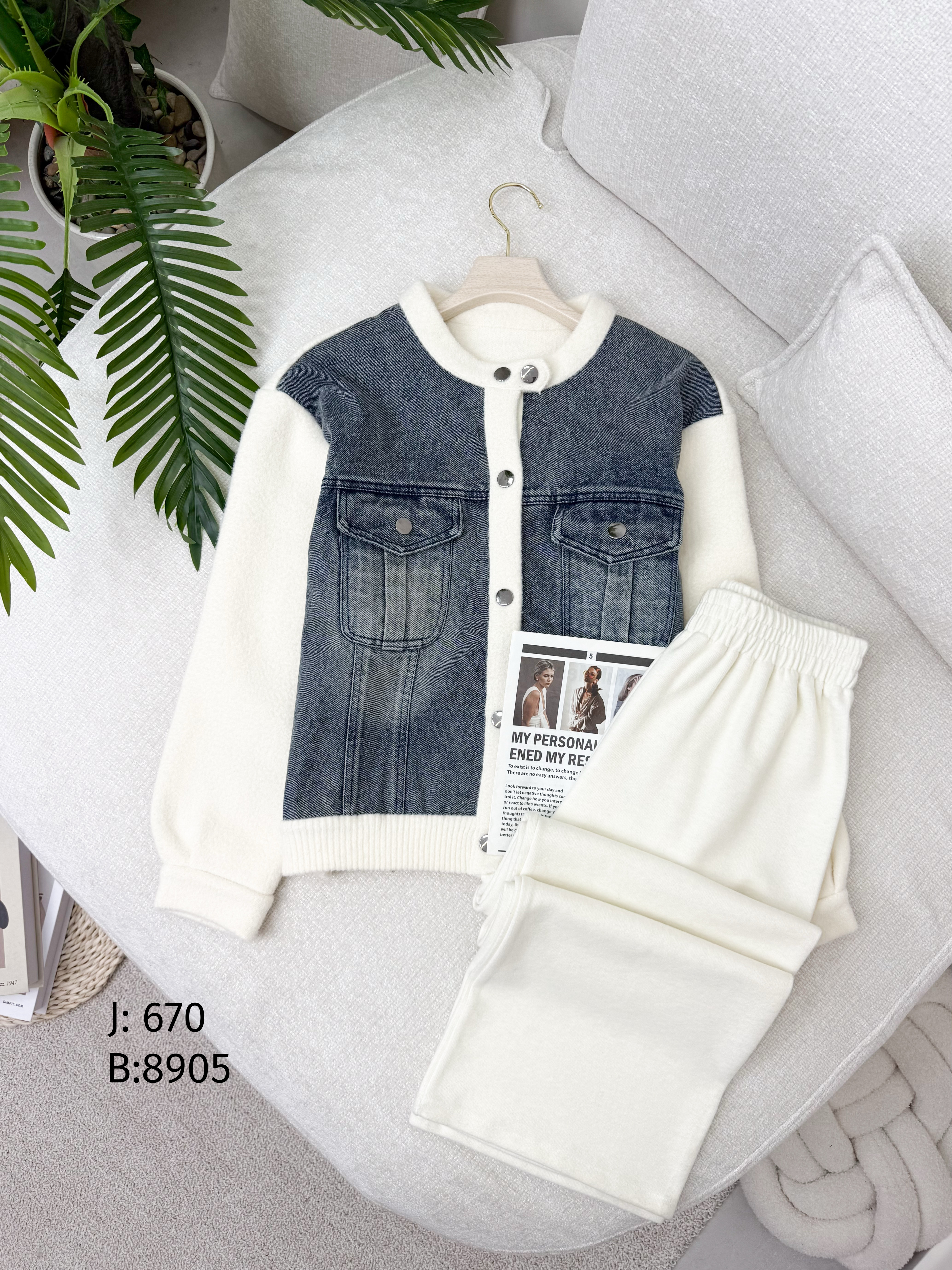 جكيت جينز كبسات مع صوف D670 اوف وايت مع جينز