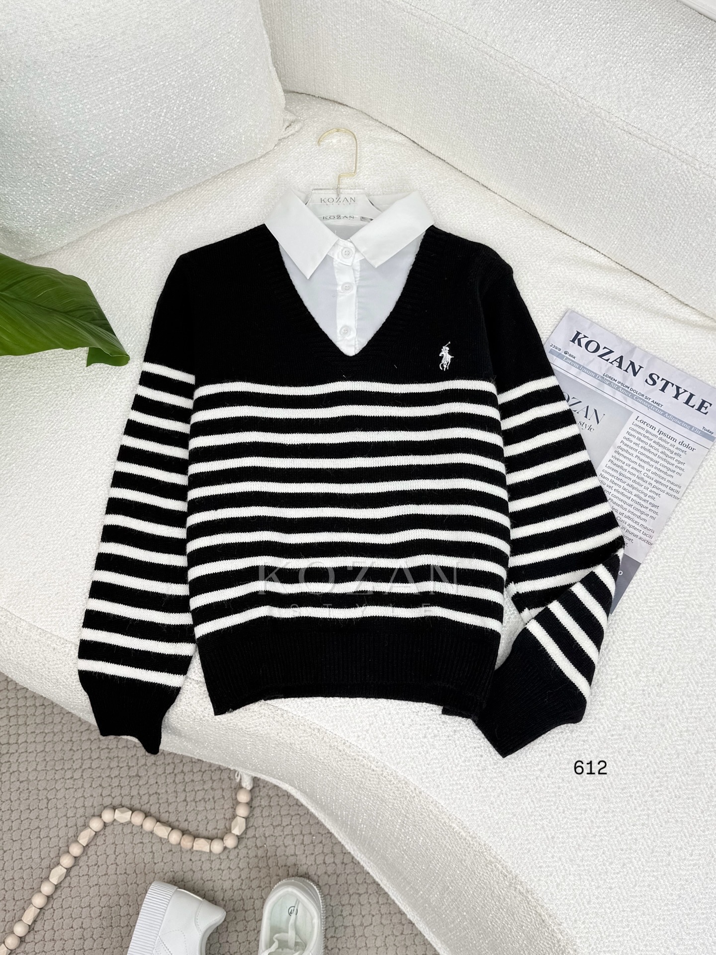 بلوزة بولو مخططة قبة قميص 612 اسود مخطط ابيض